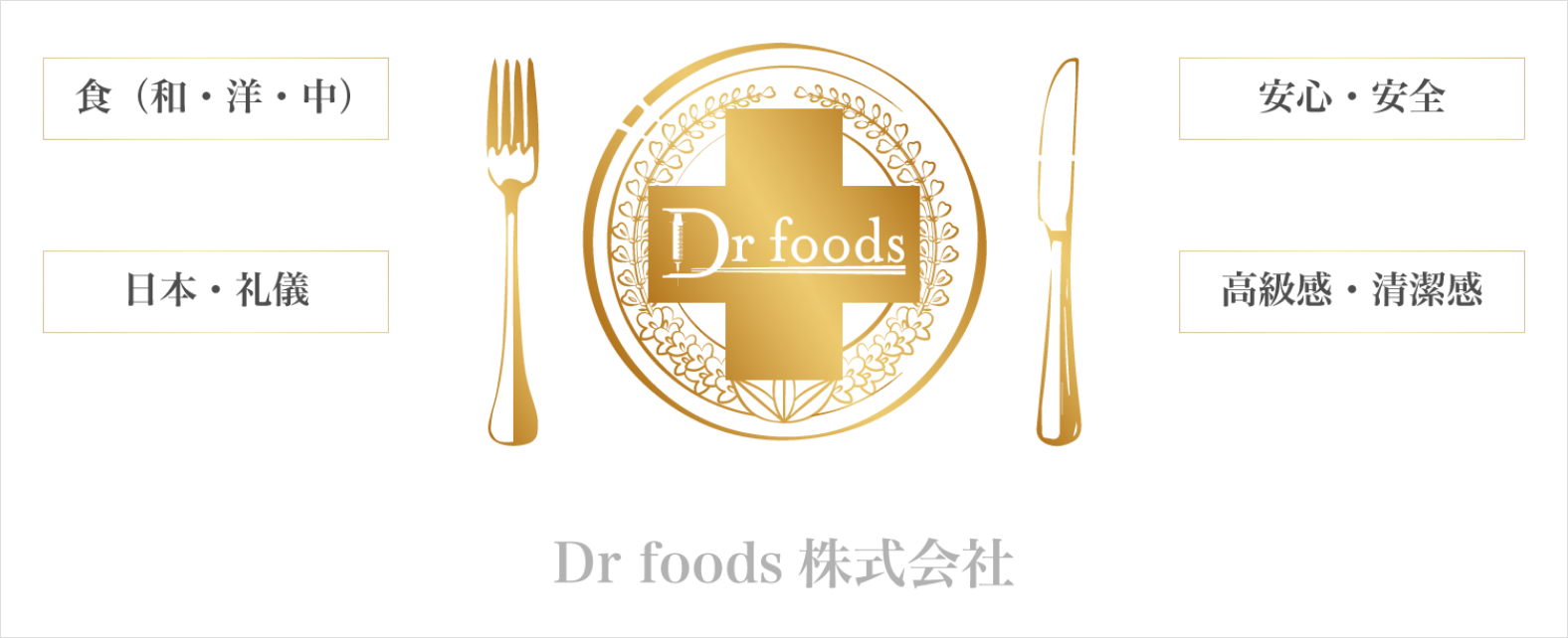会社名である「Drfoods」を取り入れたロゴは、和食・洋食・中華全てを表し、全ての食に通じていることを意味しています。